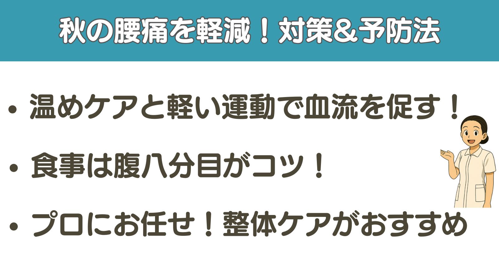 【まとめ】 40代からの秋の腰痛、原因を知って予防から始めよう!