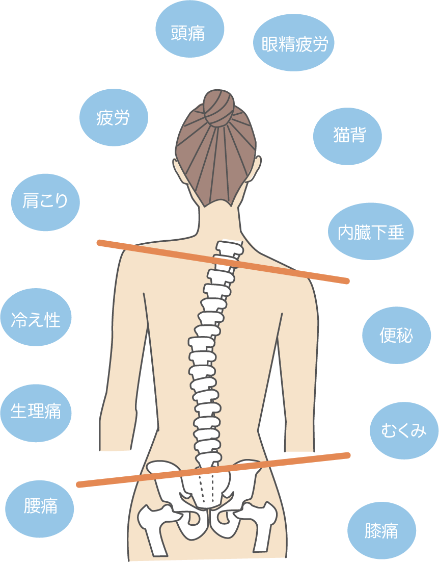 背骨がゆがむと周囲の筋肉や神経が圧迫され、血流が滞りやすくなります。その影響で内臓に現れる不調は、消化不良や便秘、生理不順といった不調などさまざまです。