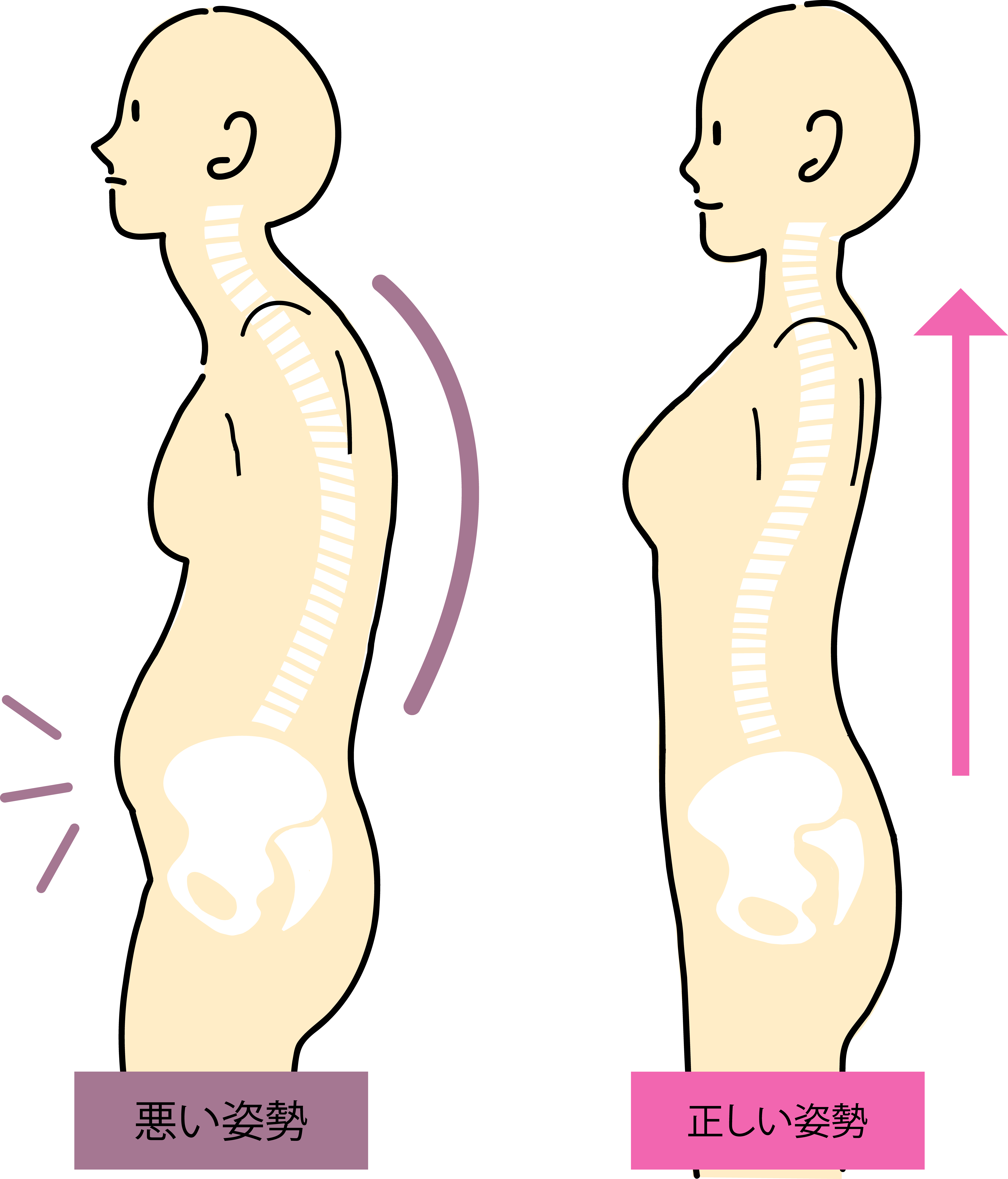 猫背や前かがみの姿勢では、胸やお腹まわりが圧迫され、深い呼吸がしづらくなります。