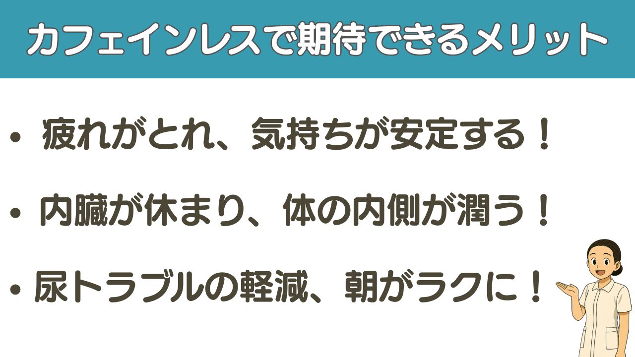 カフェインレスに切り替えることで、夜間のトイレ回数が減り、途中で目覚めにくくなります。日中のトイレの回数が気にならなくなったり、外出時の不安が減ったという声もあります。