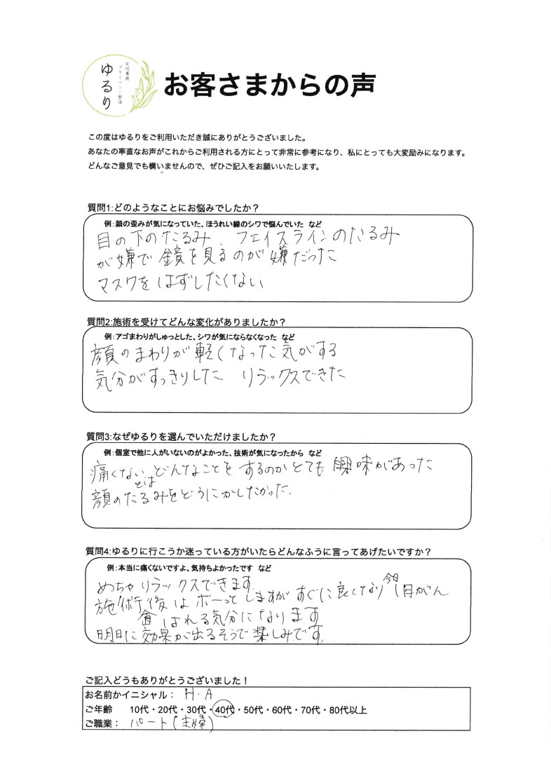 フェイスライン、頭の大きさ、やわらかさが施術後、全然違いました。また、顔がむくんでいましたが、むくみがなくなり、目がパッチリしていたのと頭痛がすっきりなくなっていました。