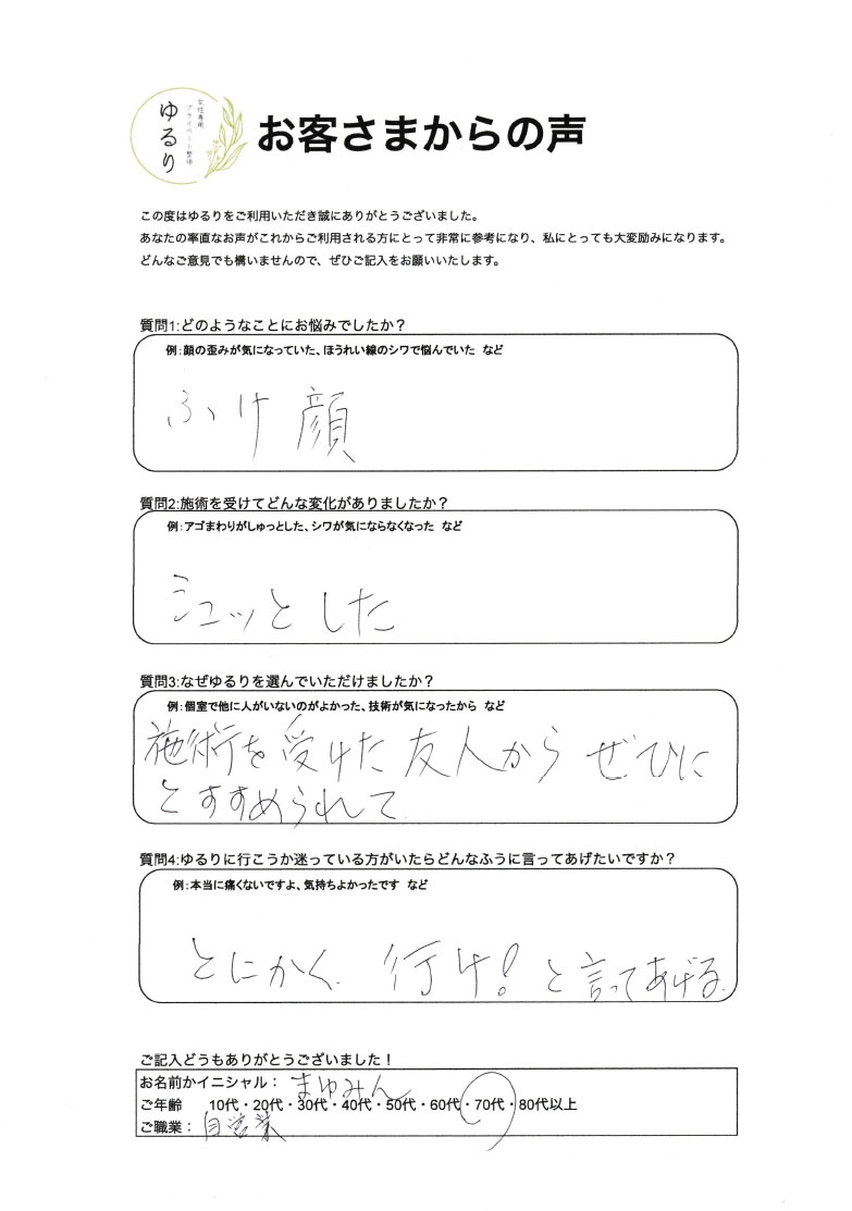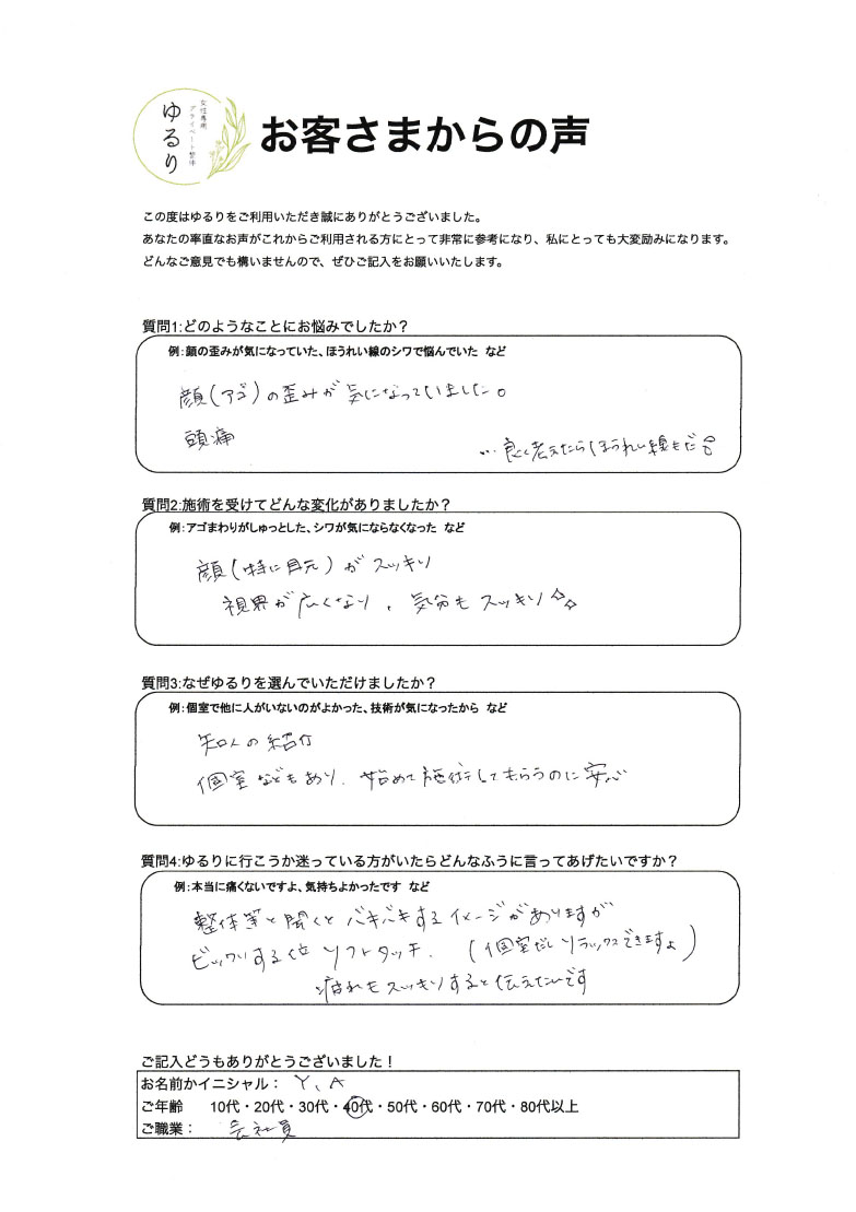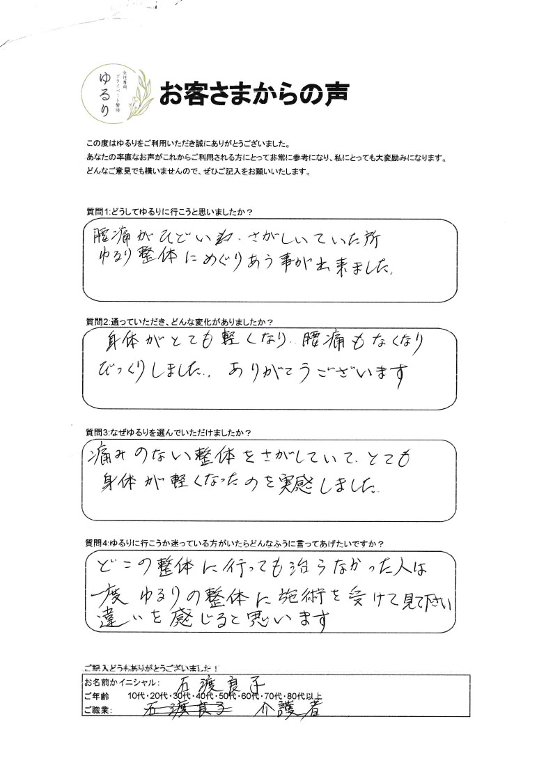 腰痛がひどい為、さがしていた所、ゆるり整体にめぐりあう事ができました。