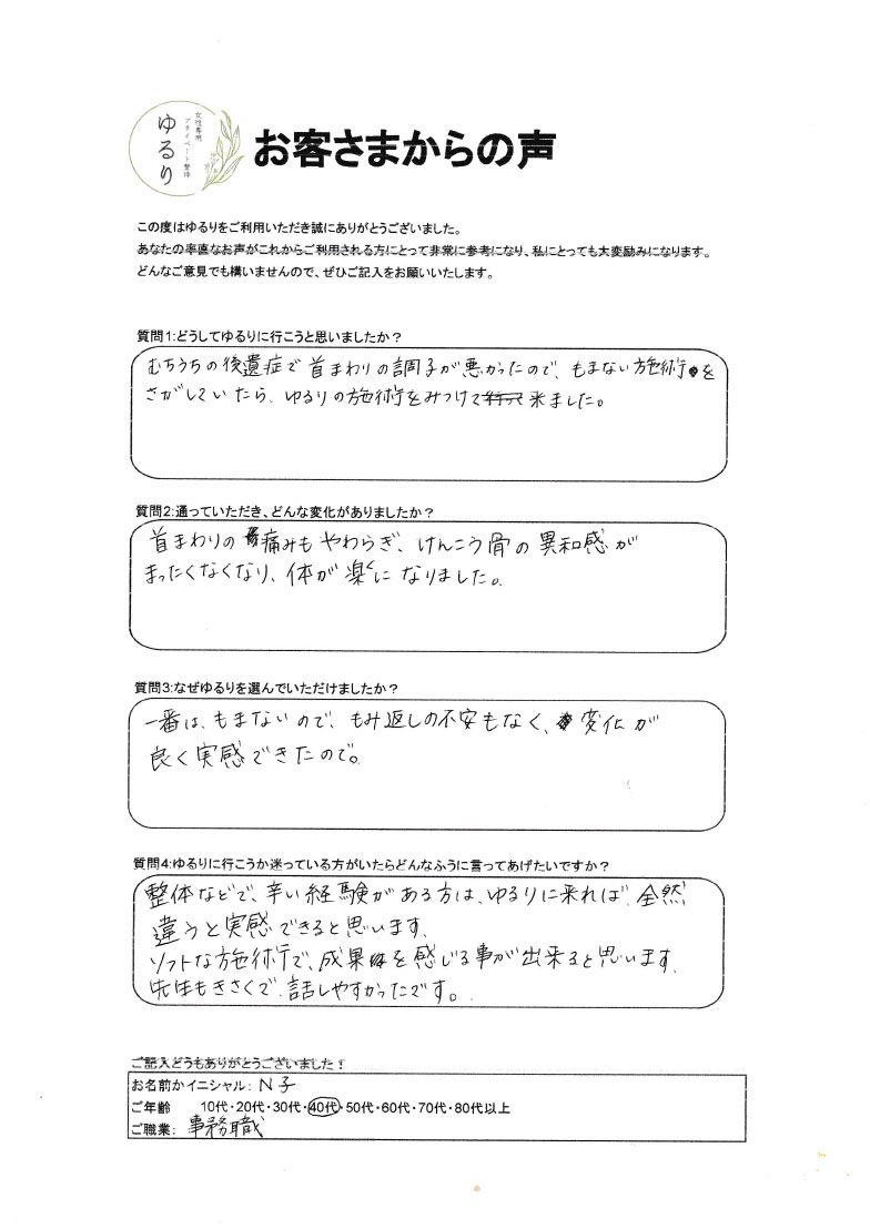 肩こりに悩まされて整体をさがしていたところ、ゆるりさんを見つけました。